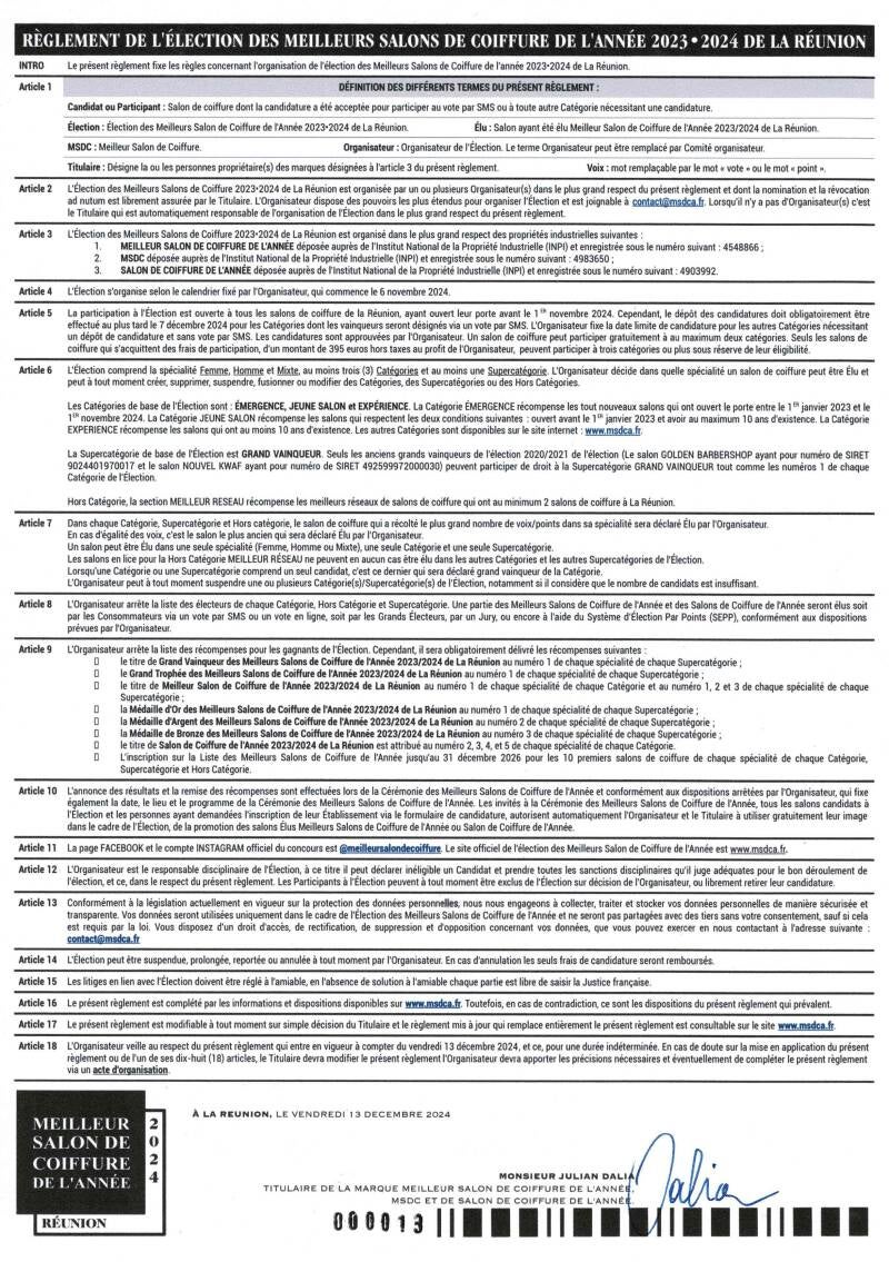 Le calendrier est modifiable à tout moment par l'Organisateur conformément au réglement de l'élection des Meilleurs Salons de Coiffure de l'Année 2023/2024 de la Réunion.